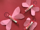 Butterfly Candy Holder Card – Cut out two identically shaped hearts. Turn them so that their pointed ends are facing each other. These will be the wings for your butterfly. Attach a rectangular piece of chocolate or other candy for the body. Then draw a face on top. Attach everything to a sheet of paper. You now have a sweet butterfly Valentine’s Day card.