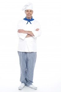 Supplies: White jacket, loose pants, clogs, toque (chef’s hat) or white construction paper, apron, flour. Optional: mixing spoon and bowl or rolling pin.