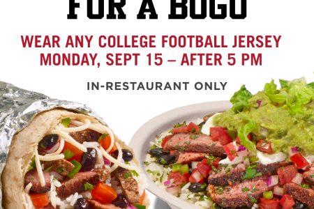 Touchdown! Chipotle is celebrating college football with a big deal for hungry fans. Gear up and show your team spirit for a complimentary entrée at the popular fast-casual Mexican restaurant.Wear your favorite (or any) college football jersey to Chipotle on Sept. 15, 2025 and … [Read more...] about Wear college football jersey to score buy-one-get-one free entrée at Chipotle