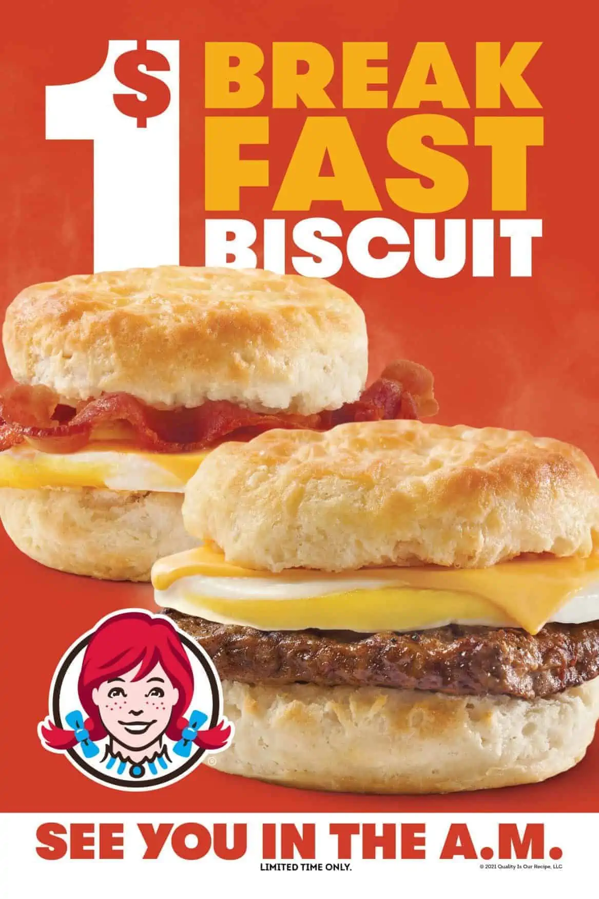 From April 1 to May 1, enjoy Wendy’s Sausage or Bacon, Egg & Cheese Biscuit for just $1. The sandwiches regularly sell for $3.49 each at most locations, so the savings are nearly 75%.