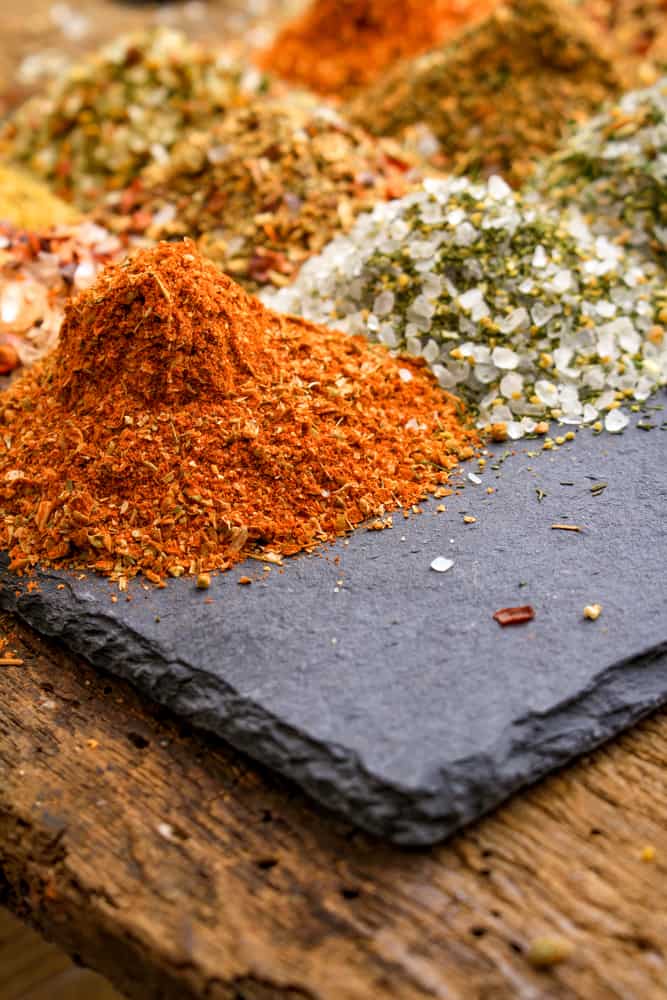 - Seasoning salt: In a large bowl, stir together 2 cups fine sea salt, 1/2 cup sugar, 1/4 cup paprika, 2 tablespoons onion powder, 2 tablespoons garlic powder, 2 teaspoons ground turmeric, 2 teaspoons thyme and 2 teaspoons ground black pepper.