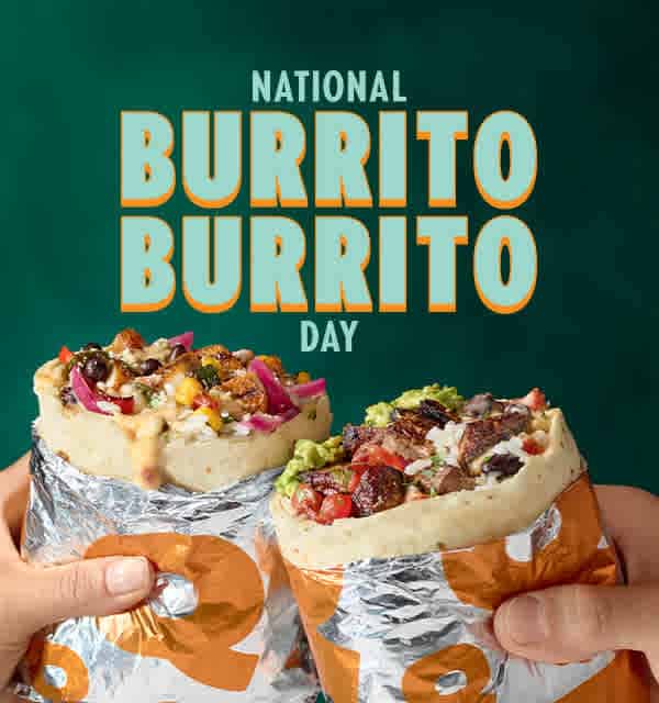 In celebration of National Burrito Day, QDOBA is offering FREE burrito or bowl with the purchase of an entrée* and drink on April 3, 2025. (*Quesadillas are excluded from the offer.)