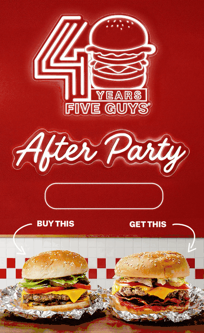 The offer is only available when you order online via Five Guys’ site or app — use promo code FGAFTERPARTY at checkout. The offer is not available in-restaurant.