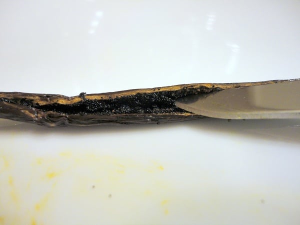 Pour about a 1/2 cup of vodka out of the bottle (do with it what you will, but I have a few ideas if you are at a loss). Slice or cut each bean down the middle, leaving it connected at the top, and exposing the tiny seeds inside. Drop the beans into the vodka, screw the lid on, and shake. Store in a cool, dark place, shaking every week or so.
