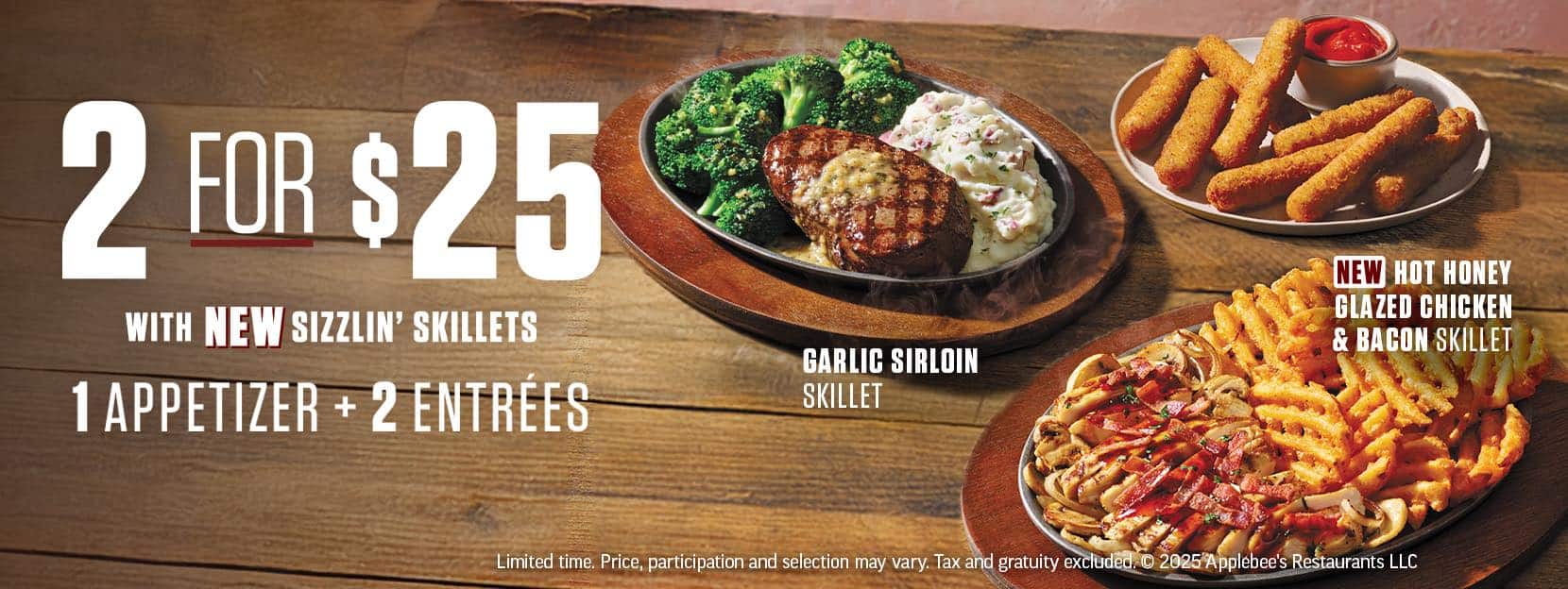 For a limited time, Applebee’s is offering diners on a budget more choices by adding two new entrées to its popular 2 for $25 meal deal at participating locations.