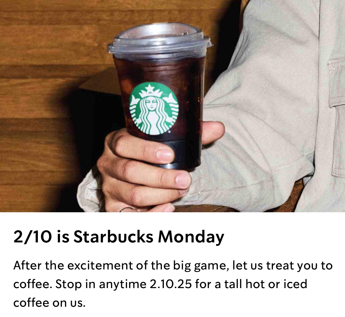 No matter who wins on Sunday, everyone can win on Monday at Starbucks. The day after the Big Game can be tough because of so much celebrating and fun, which can lead to a long Monday.